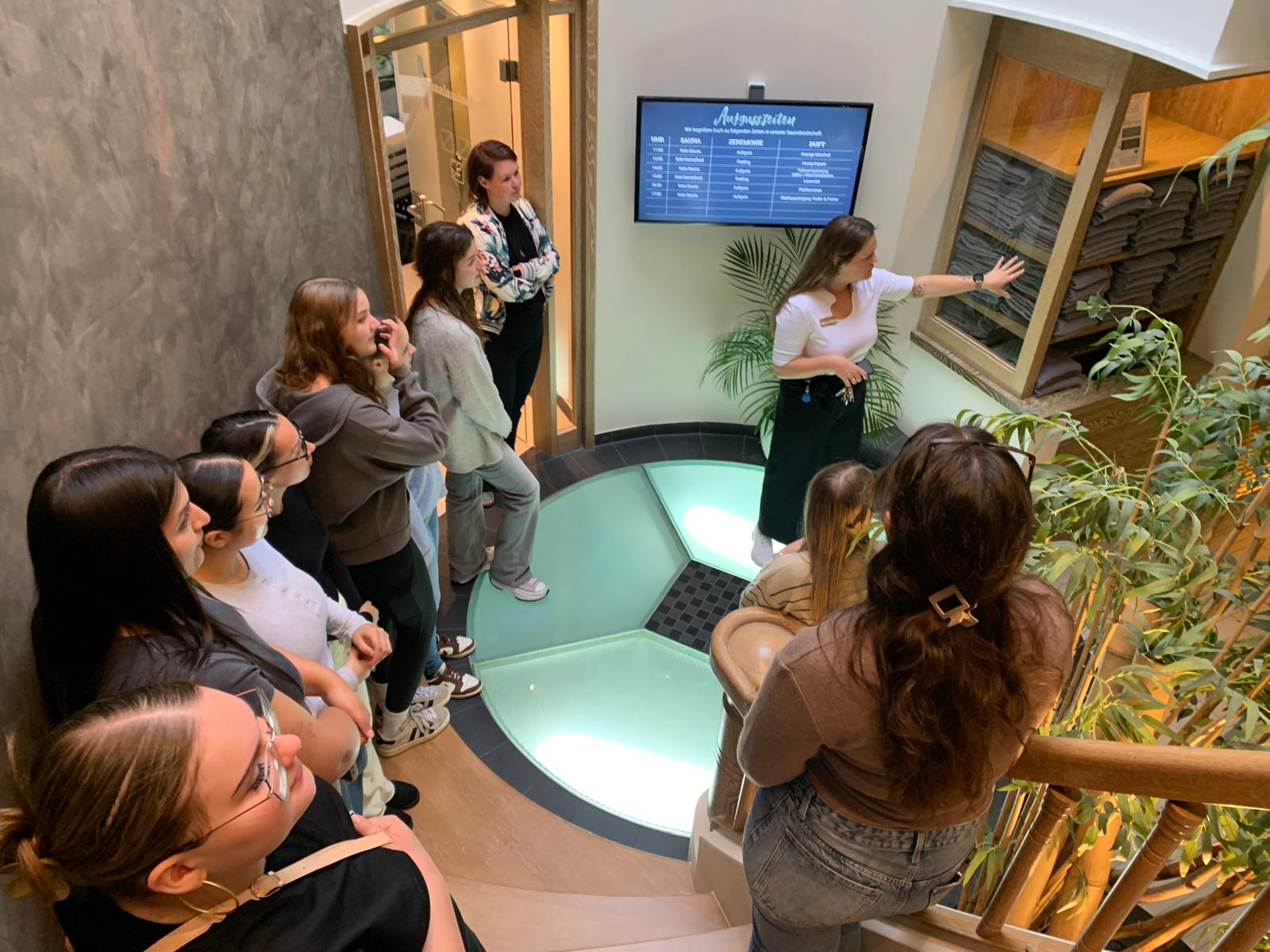 Nach einem liebevollen Empfang und einer großartigen, sehr beeindruckenden Rundführung durch den exklusiven SPA des Hotels, haben die Schülerinnen sich ein Bild vom Arbeitsalltag einer Kosmetikerin in einem Wellnesshotel machen können.