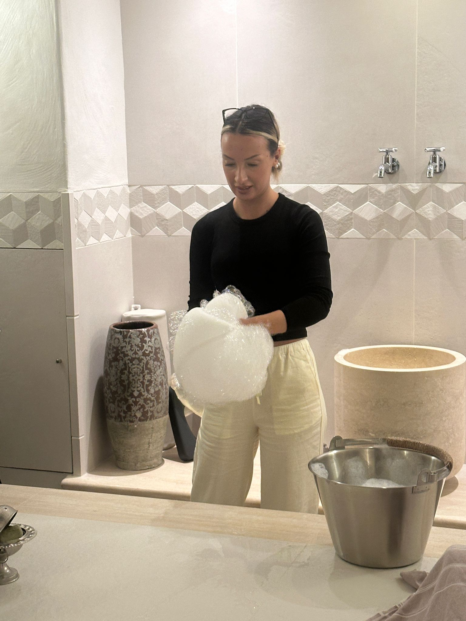 Darüber hinaus erhielten die Schülerinnen die Gelegenheit, eines der ältesten Reinigungsrituale der Welt kennenzulernen: das Hamam. Mit großer Begeisterung durften sie dabei ihre Fähigkeiten im traditionellen Schaumschlagen unter Beweis stellen und wertvolle Erfahrungen im Umgang mit diesem besonderen Pflegeritual sammeln.